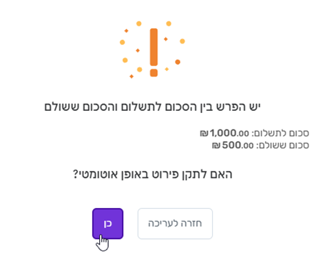 יש לאשר את התיקון האוטומטי באמצעות לחיצה על "כן". כעת, המערכת תבצע תיקון אוטומטי של הסכום ותדע להפיק מסמך על סכום חלקי שמקושר לחשבון העסקה ובנוסף, להשאיר בחשבון העסקה את היתרה הנכונה לאחר התשלום החלקי.