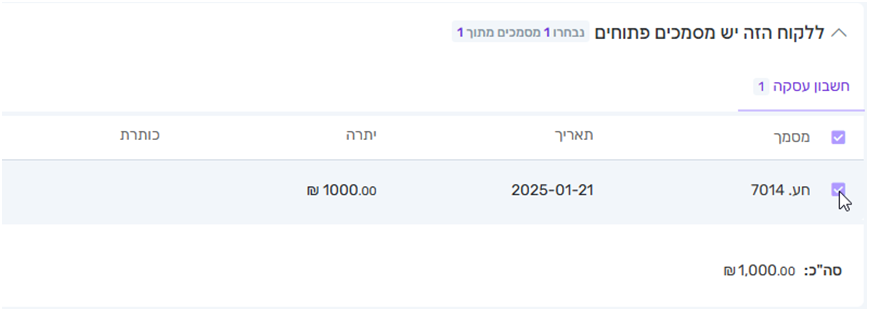 2. לאחר שבחרנו את הלקוח, המערכת תציג לנו את כלל המסמכים הפתוחים שיש לאותו לקוח. ניתן לבחור את המסמך שעליו נרצה לבסס את החשבונית מס קבלה באמצעות לחיצה על תיבת הסימון שליד שם המסמך.